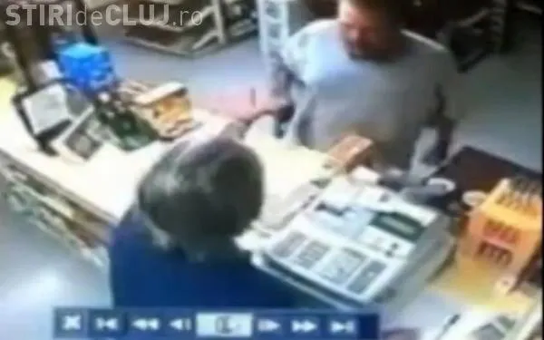 Imaginile de pe camera de supraveghere au surprins momentul în care hoțul încearcă să îl jefuiască, însă bărbatul îl oprește și într-o secundă îi pune pistolul la tâmplă, iar hoțul se retrage ușor din magazin.