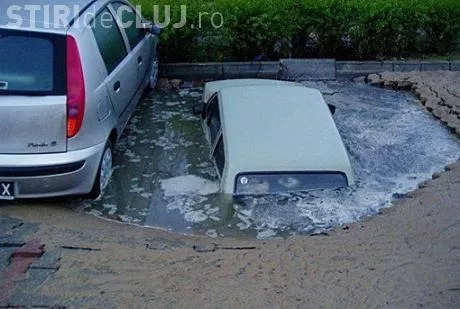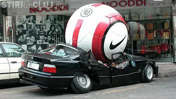 Probabil, șoferul unui frumos BMW a suferit un șoc, după ce o minge uriașă de fotbal i-a căzut peste mașină și a făcut-o praf.