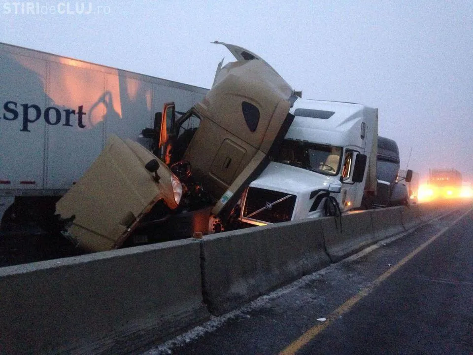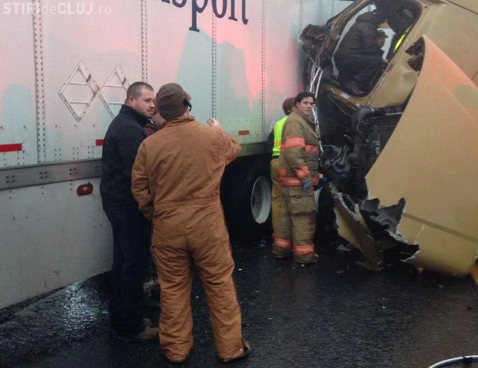 Un sofer de 27 de ani a scăpat cu viață, dupa ce camioneta pe care o conducea a fost prinsa intr-un accident in lant in care au fost implicate peste 50 de masini.