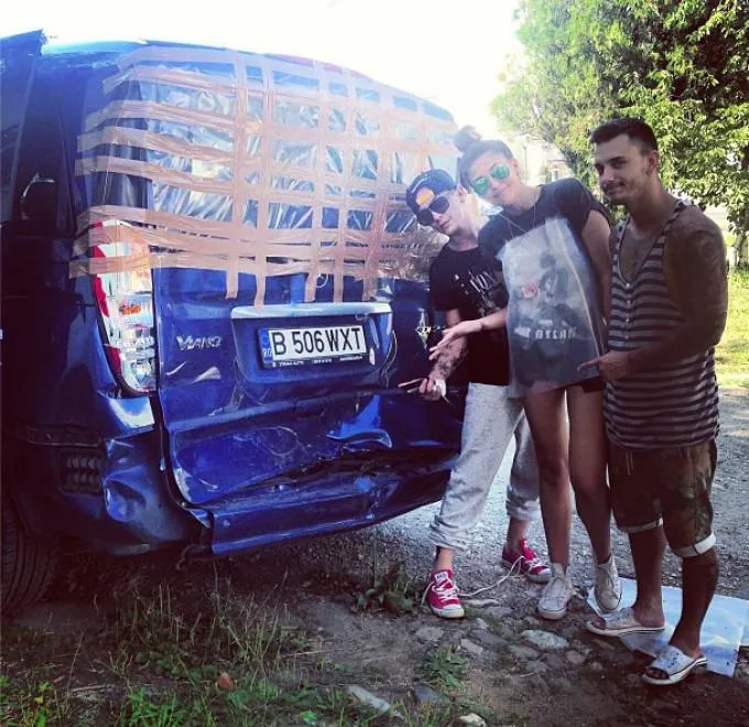 Antonia şi dansatorii ei au fost implicați într-un accident de circulație, maşina în care se aflau fiind serios avariată în partea din spate.