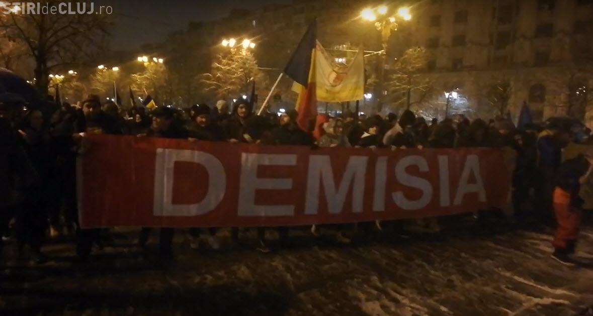 Protestatarii s-au contrat putin cu jandarmii in timp ce se aflau in Piata Universitatii din Bucuresti. Manifestantii au strigat: "Hotii, hotii!" si "Demisia!", au fluierat si au fluturat steaguri tricolore. Apoi, au plecat in mars spre Parlament.