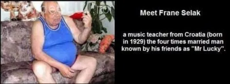 Frank Selak s-a născut în 1929 şi este profesor de muzică în Croaţia. Profesorul s-a făcut remarcat după ce a scăpat din mai multe accidente fatale. Bărbatul a scăpat cu viaţă dintr-un tren deraiat, dintr-un avion fără uşă, dintr-un accident de autobuz, dintr-o maşină incendiată, din alte două accidente de maşină şi apoi a câştigat 1 milion de dolari la loterie.