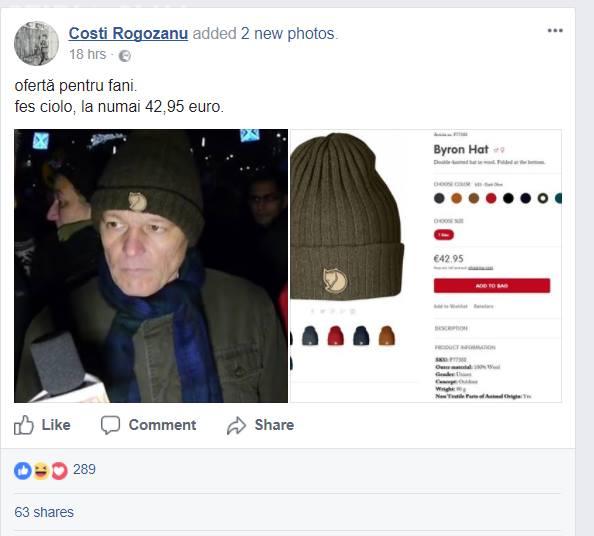 Ziaristul Costi Rogozanu a postat pe Facebook o imagine cu Dacian Cioloș, la protestul de duminică. Fesul purtat de Cioloș costă este de 42,95 euro. ”Ofertă pentru fani. fes ciolo, la numai 42,95 euro”, scria Rogozanu pe Facebook.