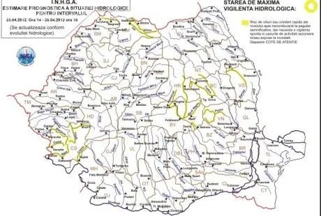 Hidrologii au emis la randul lor o avertizare cod galben de inundatii pe 13 rauri din tara, valabila de miercuri, ora 14:00 si pana joi la ora 16:00.