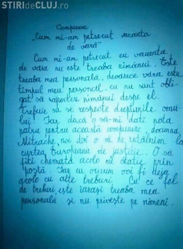 ”Este timpul meu personal. Eu nu sunt obligat să raportez nimănui despre el. Trebuie să se respecte drepturile omului. Iar dacă îmi dați nota patru pentru această compunere, doamna Mitrache, noi doi o să ne întâlnim la Curtea Europeană de Justiție”, a scris puștiul.