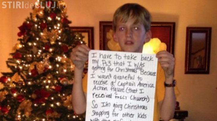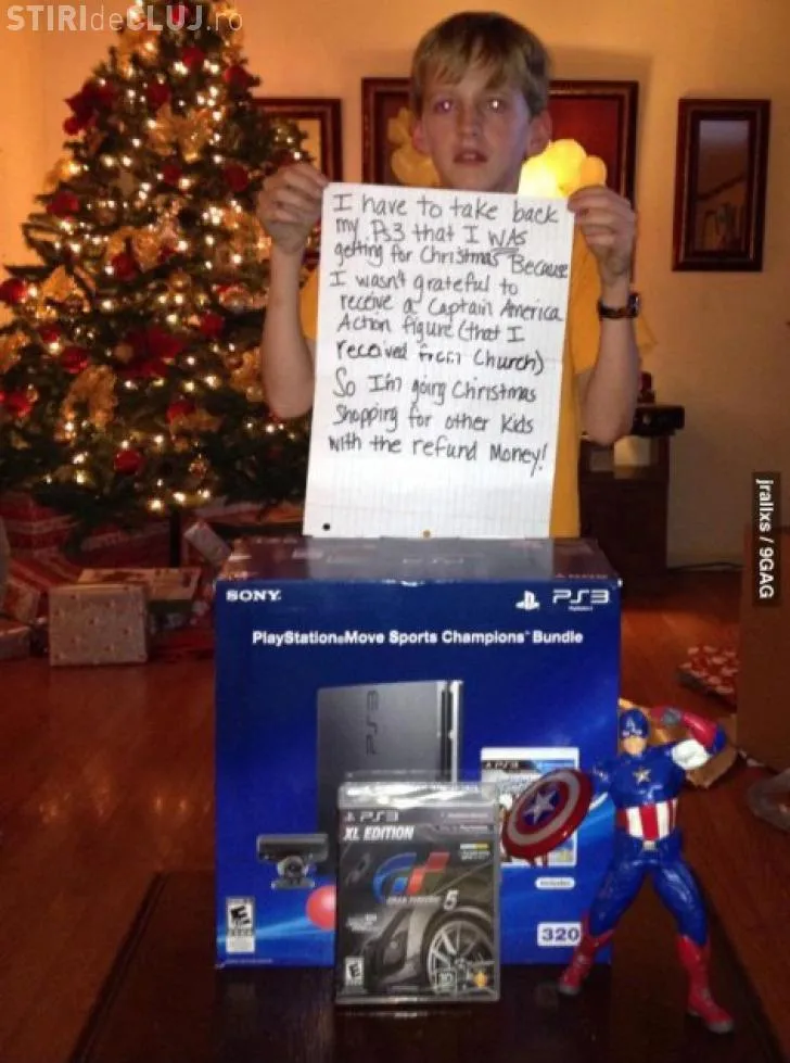 ”Trebuie să returnez consola PS3 pe care urma să o primesc de Crăciun deoarece nu am fost recunoscător pentru că am primit o figurină Captain America de la Biserică. Prin urmare, voi merge la cumpărături de cadouri pentru alţi copii cu banii primiţi înapoi”, spune mesajul pe care îl ţine băiatul.