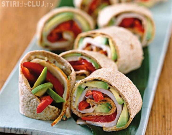 Fiecare bucată de lipie se presară cu friptură de curcan, peste care se adaugă legumele. Se rulează lipia, se prinde în scobitori şi se aşează pe un platou. Se serveşte cu un sos făcut din 2 linguri de iaurt, o linguriţă de muştar Dijon şi una de ulei de măsline.