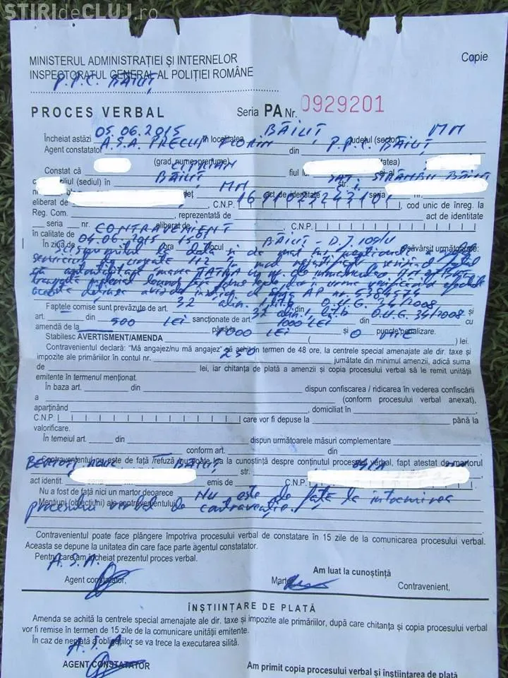Iata fotografia procesului verbal intocmit de agentul constatator minune, domnul Florin Precup. Acest organ din comuna Baiut, judetul Maramures i-a trimis acasa amenda omului care a indraznit sa sune la 112. Oare ce inseamna asta pentru viitorul Radarul Padurilor?