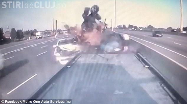 Accidentul a fost surprins de camerele unei mașini de tractări, care se pregătea să tracteze autoturismul defect.