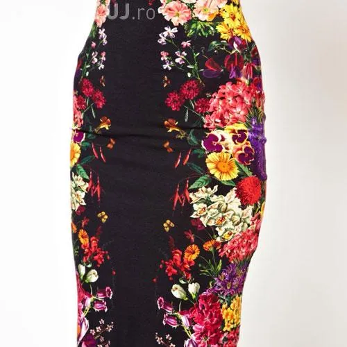 Fusta cu talie inalta din imagine avantajeaza deopotriva femeile plinute, cat si pe cele slabe, fiind si ideala pentru a ascunde burtica. Imprimeul este in oglinda, asadar, marginile sunt identice si parca s-ar uita una la cealalta, in timp ce portiunea din mijloc este uni, neagra. Daca ai burtica si vrei sa o ascunzi, poti opta pentru o astfel de fusta cu talie inalta pentru ca distrage atentia de la “centru” si o duce catre solduri.