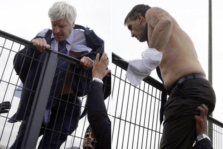Cei doi au fost nevoiți să sară un gard pentru a scăpa. Șapte persoane au fost rănite.