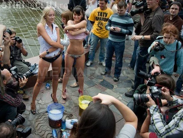 Fetele au ramas numai in bikini dupa ce i-au invitat pe trecatori sa isi goleasca berile intr-o galeata, iar ele renuntau rand pe rand la haine.