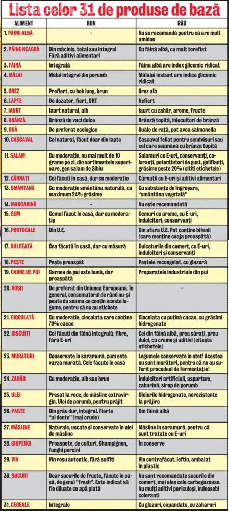 Cunoscutul nutrișionist, Gheorghe Mencinicopschi, a realizat un tabel cu 31 de alimente sănătoase și nesănătoase.
