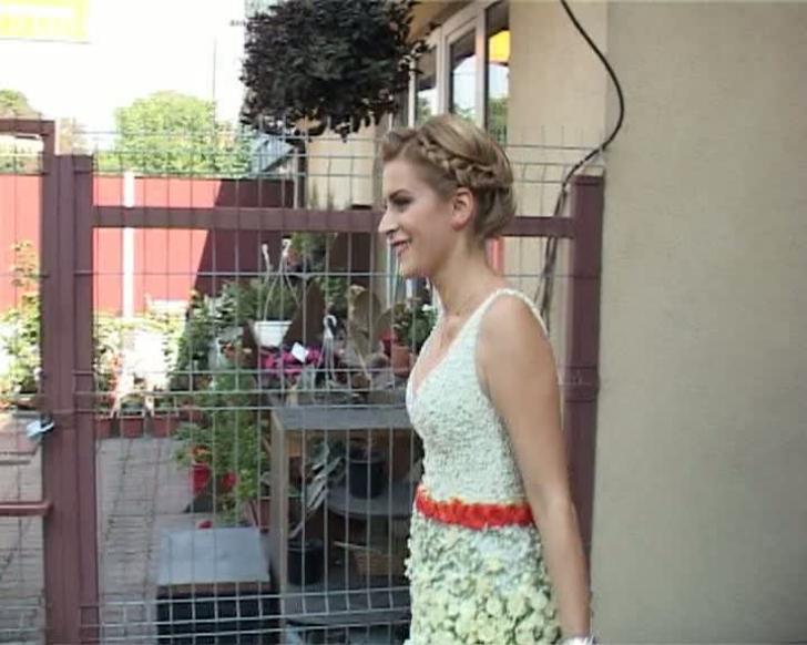 O mireasă din Timişoara a purtat la nuntă o rochie specială, realizată exclusiv din flori naturale, de culoare albă.