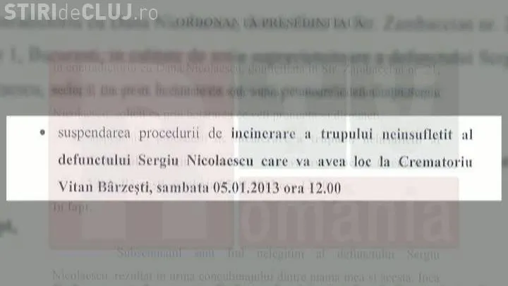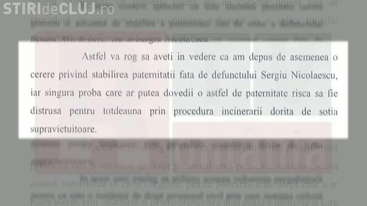 ”Mama mea nu a încercat să facă publică această informaţie, întrucât suntem o familie onestă. Am depus o cere pentru stabilirea paternităţii față de defunctul Sergiu Nicolaescu, iar singura probă care ar putea dovedi o astfel de paternitate riscă să fie distrusă pentru totdeauna prin procedura incinerării dorite de soția supraviețuitoare”, scrie într-un document prezentat de România TV.