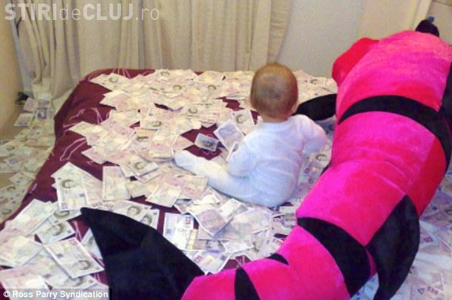 Fotografia care a SCANDALIZAT Anglia! Un bebelus roman se tavaleste in bancnote de 20 de lire furate din bancomate