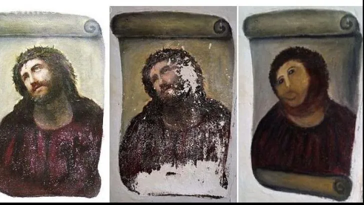 Fresca ”Ecce Homo”, realizată în urmp cu 100 de ani de Elias Garcia Martinez, îl înfățișează pe Iisus Hristos, și este iubită de enoriaşii bisericii Sanctuary of Mercy, de lângă oraşul spaniol Zaragoza. O enoriaşă a început să o restaureze, dar ce a ieșit este demn de un film de comedie.