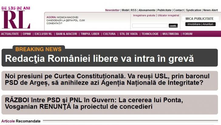 Jurnaliștii de la ”România liberă” au anunțat, joi, pe site - ul ziarului că intră în grevă.