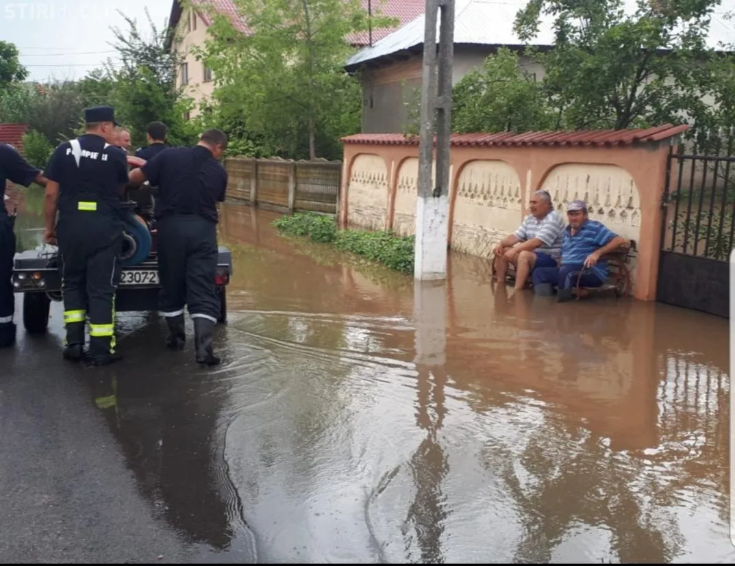 Doi bărbați stau pe o bancă, în fața unei case, cu picioarele în apă, în timp ce pompierii lucrează pe stradă pentru a scoate apa din curți. Imaginea a fost surprinsă în comuna Ţigăneşti, judeţul Teleorman, și a devenit virală pe internet.