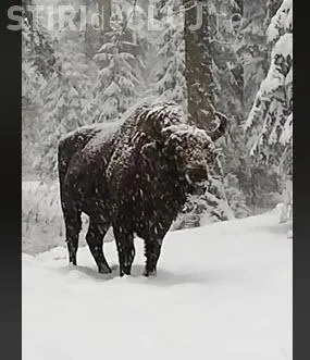Imagini superbe cu un zimbru mascul troienit de ninsorile recente din zona montană din Parcul Natural Vanatori Neamt au fost postate de Romsilva.