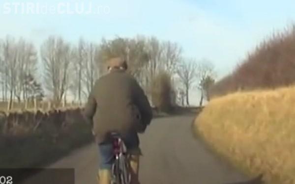 O tanara imbracata in echipament de jogging nu a mai suportat situatia si a fugit dupa el, lovindu-l. Politia incearca acum sa o gaseasca pe femeie si pe biciclistul care a incurcat traficul in zona orasului Bibury, Gloucester.