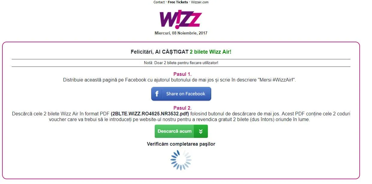 Sub titlul ”Wizz Air oferă 2 bilete gratuite TUTUROR! Pentu că a împlinit 15 ani de la primul zbor”, oamenii sunt la un pas de a fi înșelați.