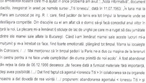 Tiriac a furnizat doar doua note informative dupa care a si fost abandonat ca agent, intrucat a dat dovada de "rea-vointa".