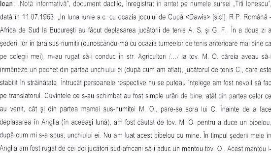 Cea de-a doua nota informativa data de Tiriac este la fel de nefolositoare pentru securitate, intrucat Ioan Tiriac poveste despre intalnirea la Paris cu un jucator de tenis care i-a spus ca vrea sa isi petreaca viitorul concediu in Romania.
