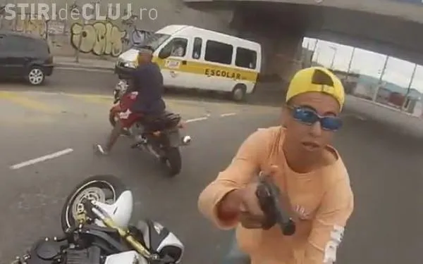 În imagini se observă cum un bărbat este somat să coboare de pe motocicletă, sub amenințarea cu pistolul, după ce doi tineri opresc în fața lui.
