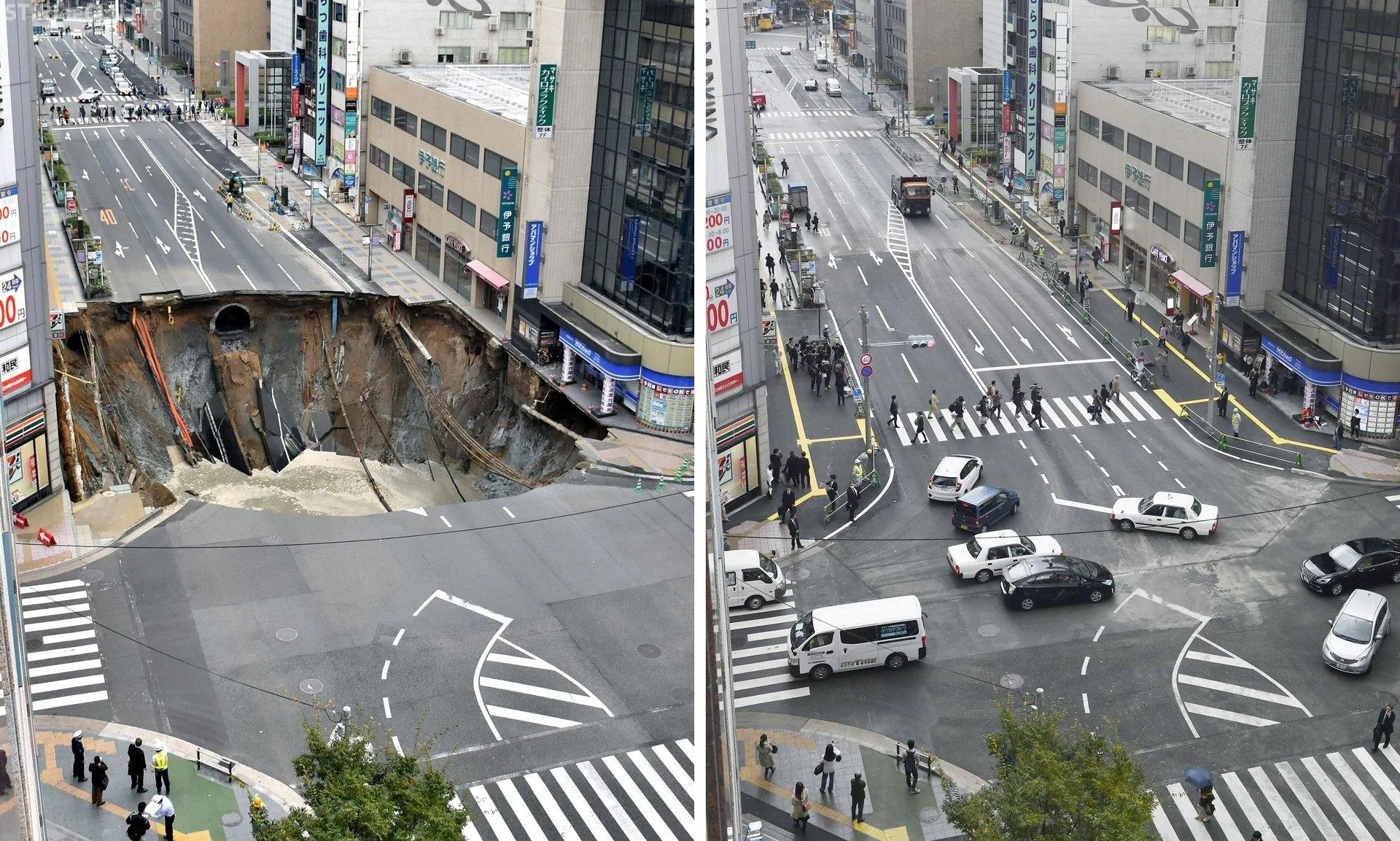 În 8 noiembrie, pavajul a început să se scufunde la intersecția a două importante bulevarde, în fața gării Hakata.