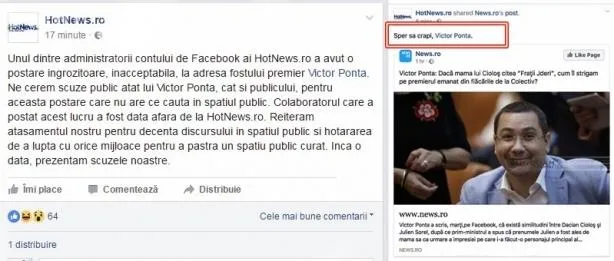”Unul dintre administratorii contului de Facebook ai HotNews.ro a avut o postare îngrozitoare, inacceptabilă, la adresa fostului premier Victor Ponta. Ne cerem scuze public atât lui Victor Ponta, cât și publicului, pentru această postare care nu are ce căuta în spațiul public. Colaboratorul care a postat acest lucru a fost dat afară de la HotNews.ro. Reiterăm atașamentul nostru pentru decența discursului în spațiul public și hotărârea de a lupta cu orice mijloace pentru a păstra un spațiu public curat. Încă o dată, prezentăm scuzele noastre”, a transmis HotNews.