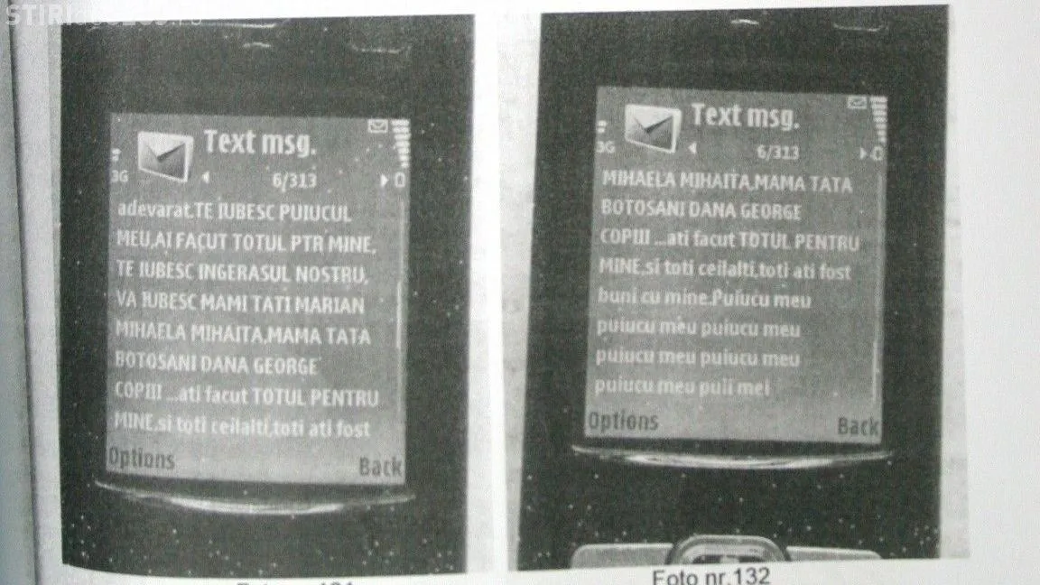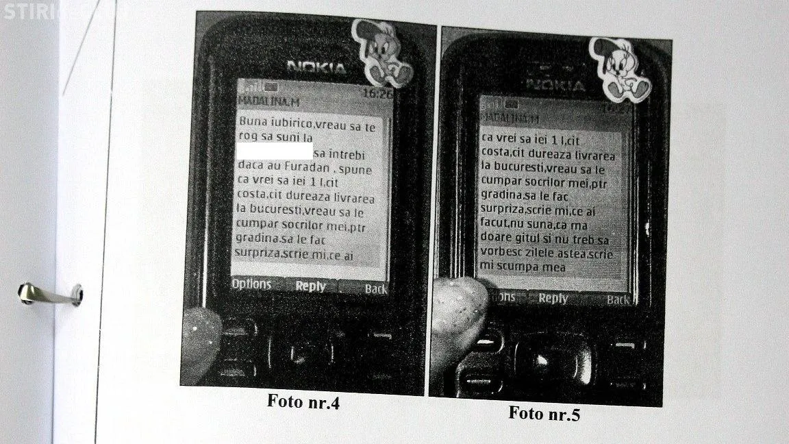 "Buna iubirico. Vreau sa te rog sa suni la 0768.XXX.XXX sa intrebi daca au Furadan. Spune ca vrei 1 litru, cat costa, cat dureaza livrarea la Bucuresti. vreau sa le cumpar socrilor meu pentru gradina, sa le fac surpriza. Scrie-mi ce ai facut. Nu ma suna, ca ma doare gatul si nu trebuie sa vorbesc zilele astea. Scrie-mi scumpa mea", i-a scris Madalina fanei sale, Adriana Buta.