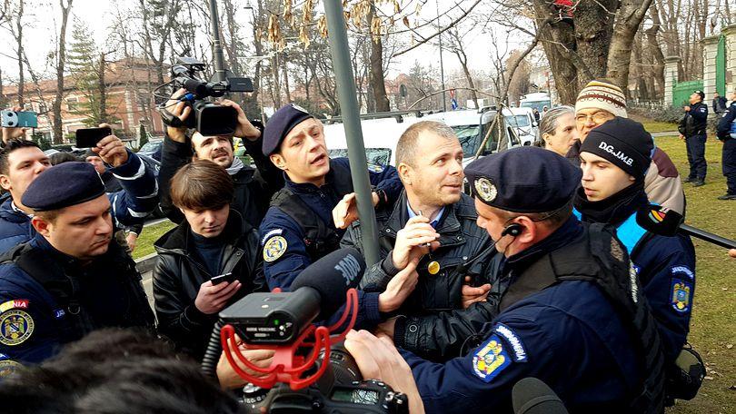 Reprezentanţii Jandarmeriei le-au cerut să plece, pentru că nu aveau autorizaţie în acest sens. Mai mulţi reprezentanţi ai Federaţiei Naţionale al Revoluţionarilor au subliniat că au autprizație pentru a protesta pe o durată de 30 de zile, din 4 ianuarie, şi că alţi manifestanţi nu pot să participe la acţiuni de protest în această zonă. O parte din cei care manifestau împotriva PSD au fost de acord să plece, nu și jurnalistul Mălin Bot.