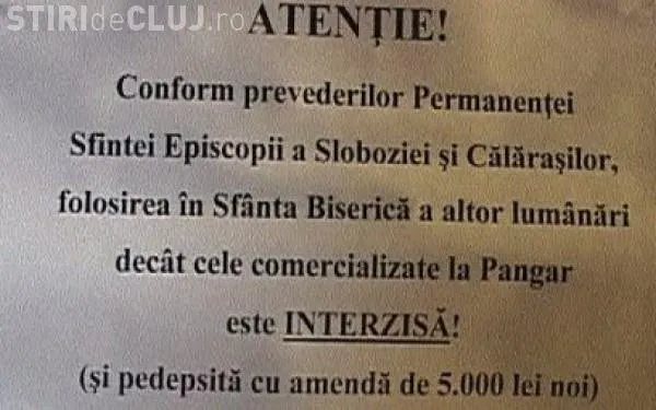 "ATENTIE! Conform prevederilor permanentei Sfintei Episcopii a Sloboziei si Calarasilor folosirea in Sfanta Biserica a altor lumanari decat cele comercializate la Pangar este INTERZISA! Si pedepsita cu amenda de 5.000 lei noi.", este textul ce apare pe afis.
