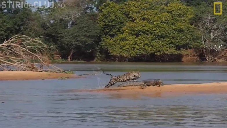 Un jaguar a fost filmat în timp ce vâna un crocodil. Felina a acționat la fel ca și un aligator, sărind din apă asupra prăzii.