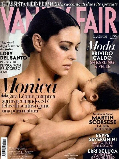 Monica Bellucci, goala, cu bebelusul ei, pe coperta revistei Vanity Fair - FOTO