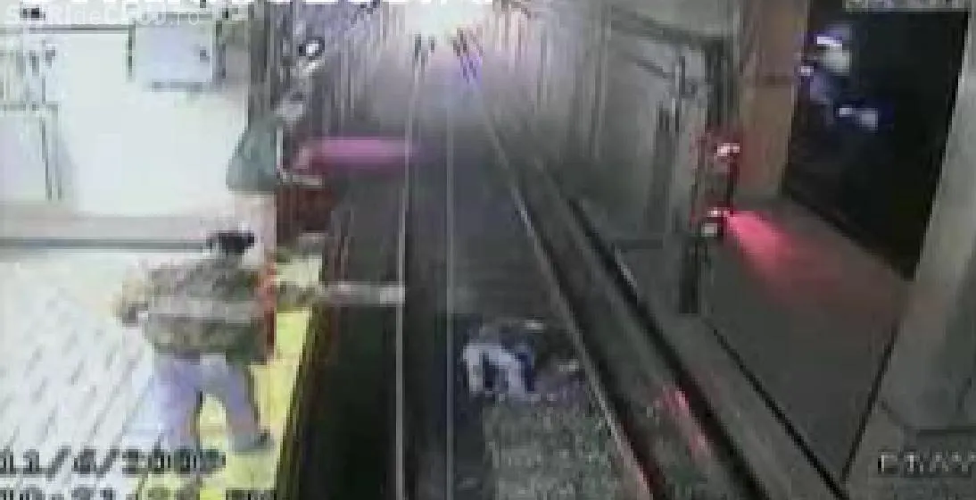 Un barbat vede ce se intampla si incearca sa o ajute, isi da seama ca nu are timp suficient sa coboare dupa ea si incepe sa faca semne disperate catre conductor. Intre timp i se alatura alti doi barbati. In final, metroul se opreste chiar peste jumatate din corpul femeii, din fericire, fara a o rani. Aceasta iese de sub metrou si ajutata de cei trei barbati se urca pe peron.