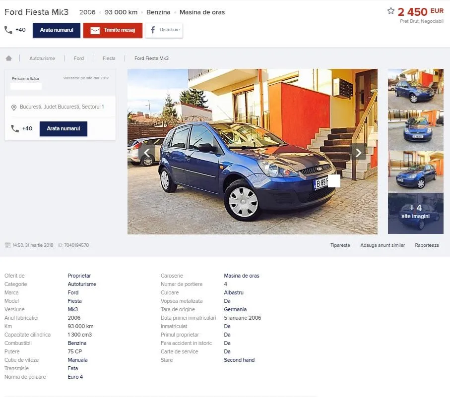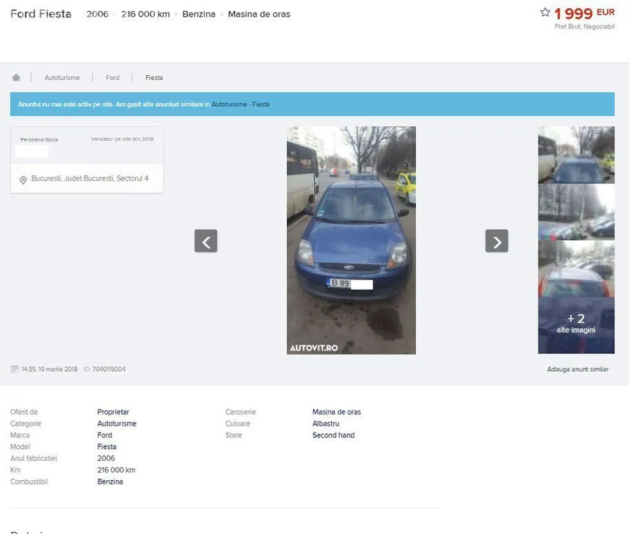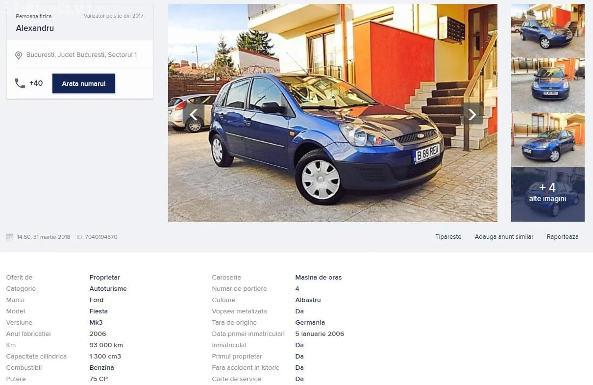 Samsarii știu că toată lumea va căuta maşini care au până în 100.000 de km şi care nu costă mai mult de 2.500 de euro. Vezicatface.ro a găsit un Ford Fiesta numai bun de înşelat. Vânzătorul nu a şters, însă, primul anunţ de vânzare.