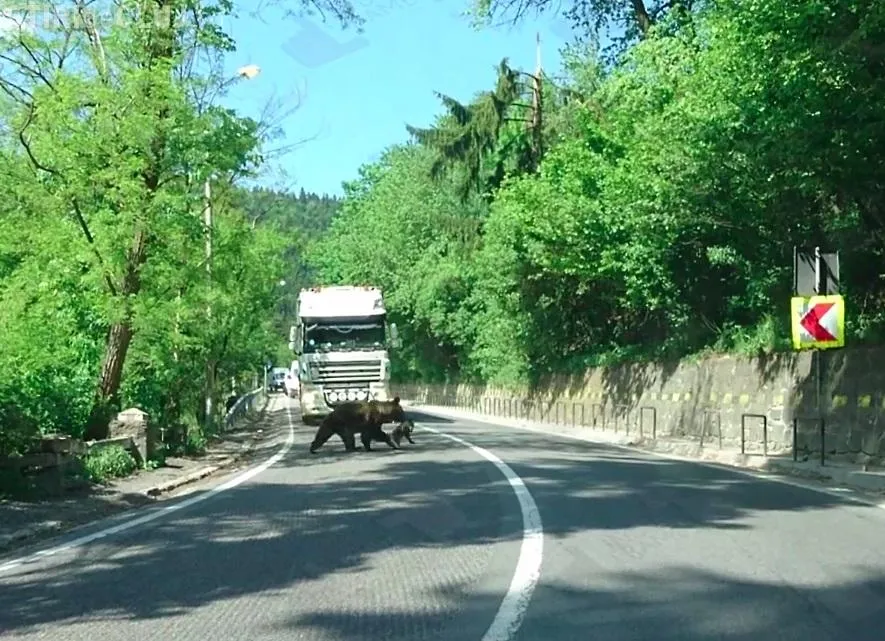O ursoaică a oprit traficul la Băile Tușnad, pentru a-și traversa puiul - VIDEO