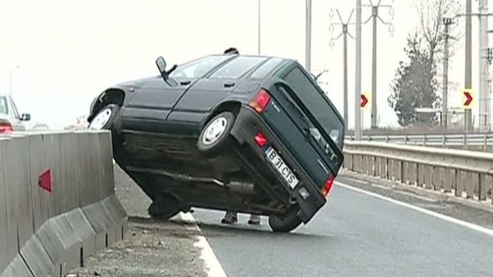 Femeia conducea un TICO, a ratat intrarea pe autostradă şi a încercat să schimbe brusc direcţia. Ea s-a trezit cu maşina pe parapetul de protecţie, la un pas să se răstoarne.