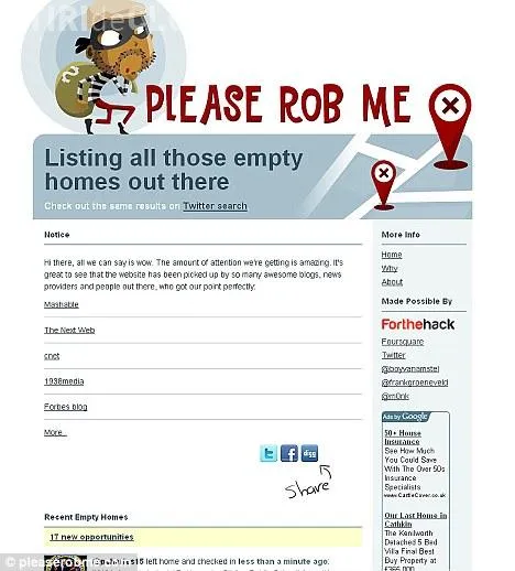 Site-ul, "Please rob me" (n.r. Te rog, fura-ma), lansat in aceasta saptamana, a fost criticat pentru ar fi instrumentul perfect pentru orice hot care se respecta. Cele trei creiere din spatele site-ul insista si spun ca ei nu ii ajuta pe spargatori, ci scot in evidenta pericolele pe care le aduce cel mai recent site de socializare, unde toti utilizatorii anunta locul unde se afla minut cu minut. Reteaua Foursquare, in care utilizatorii posteaza online locatia in care sunt, reprezinta o mina de aur pentru sparagatori, spun fondatorii site - ului "Te rog, fura-ma".