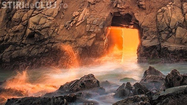 Fotografie a fost făcută în California de un canadian. Peisajul poate fi observat numai câteva săptămâni pe ani, când soarele apune direct în spatele arcului de piatră, conform Mirror.