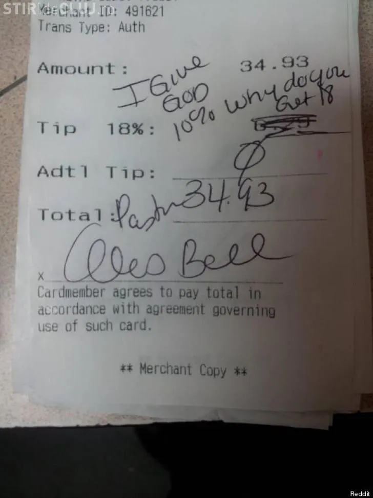 Pastorul, o femeie din Statele Unite, a făcut o consumație de 34,93 de dolari, iar pe nota de plată se sugera faptul că ar trebui să lase un banșiș de 18%. Consumatorul s-a înfuriat și a scris cu pixul: ”Îi dau lui Dumnezeu 10%, tu de ce să primeşti 18%?”.