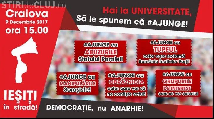 ”Hai la Universitate,/Să le spunem că #ajunge/ cu abuzurile statului paralel!/ cu tupeul celor care reclamă România înaltelor porți!/ cu manipulările soroșiste!/ cu obrăznicia cu care vor să confiște votul!/ cu grupurile de interese care ne vor colonie!" este mesajul transmis de organizatori pe afișul evenimentului promovat de PSD Dolj pe pagina de Facebook.
