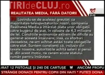 "Lovita de aceleasi greutati ca si majoritatea telespectatorilor nostri, compania Realitatea Media a intarziat plata unor obligatii catre bugetul de stat in valoare de 4,3 milioane de lei. Conditiile extrem de dificile au generat aceasta intarziere, insa, cu eforturi deosebite, ne-am achitat astazi toate datoriile catre stat. Suntem constienti ca inclusiv din taxele noastre autoritatile achita salarii si pensii, si, din acest motiv, ne cerem scuze statului roman pentru intarziere".