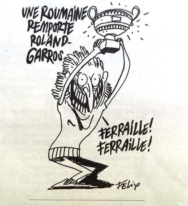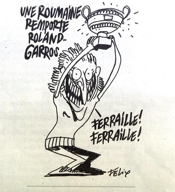 Publicaţia franceză de satiră Charlie Hebdo a ironizat victoria Simonei Halep la turneul de la Roland Garros publicând, în urmă cu o săptămână, sub titlul “O româncă câştigă Roland Garros-ul” o caricatură reprezentând o persoană care ridică trofeul deasupra capului şi spune “Fier vechi, fier vechi”.