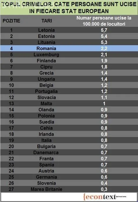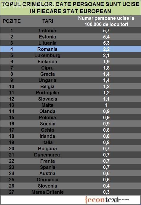 A fost realizată un top al țărilor din Europa cu cele mai multe persoane ucise, din care reiese că rata crimelor din România este de 2,2 la suta de mii de locuitori.
