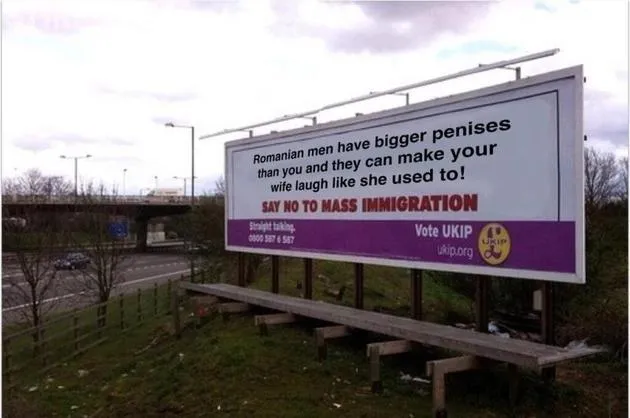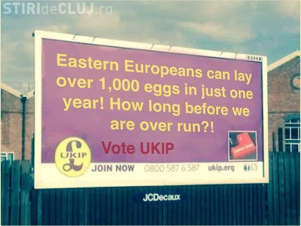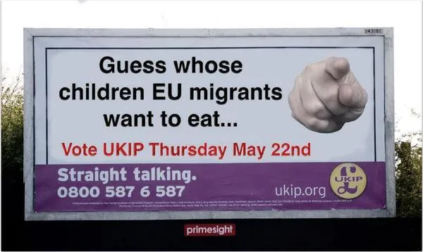 Partidul Independenţei din Marea Britanie (UKIP) s-a folosit de retorică anti-migranţi pentru a crește în sondaje. ”26 de milioane de milioane din Europa îşi caută de lucru. Al cui loc de muncă îl vor?”, au scris cei de la UKIP pe unul dintre aceste panouri.