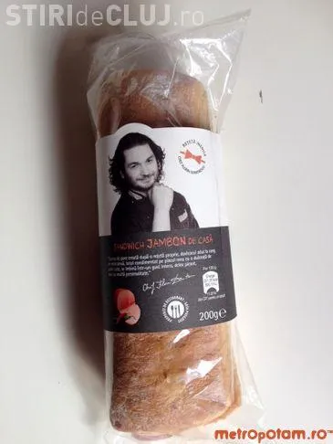 Sandvis jambon de casa - 13,25 lei. Pe eticheta scrie paine ciabatta 50%, jambon 27,27%, dulceata 9,09%. Cu siguranta au gresit proportiile, pentru ca painea era cam 80%, scriu cei de la metropotam.ro, care le-au și testat.