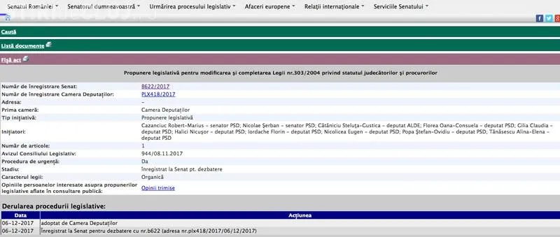 Legea statutului magistraților apare ca votată pe site -ul Senatului, dar totul este un fals.